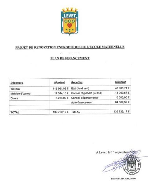 Dans le cadre du projet de renovation des classes de l'école maternelle, vous trouverez ci-joint le plan de financement de l'opération.