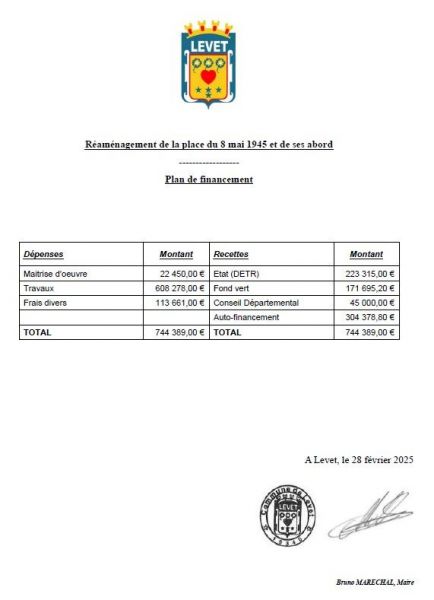 Dans le cadre du projet de renovation de la place et de ces abords, vous trouverez ci-joint le plan de financement de l'opération.